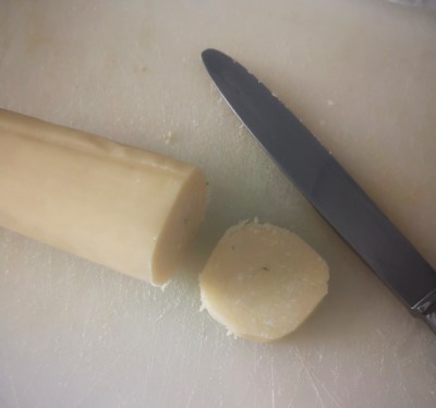 Il faut à présent formez des boudins. Pour cela, coupez 2 feuilles de papier cuisson. Placez votre 1er pâton sur l’une des feuilles. Roulez-le un peu entre vos doigts pour l’allonger, puis roulez la pâte dans la feuille. Pressez une règle contre la pâte, par dessus le papier pour bien la serrer. Faites un rouleau de 4 cm de diamètre.