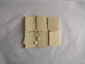 Comme je n’ai pas de beurre de tourage, je fait des tranches avec ma plaquette de beurre, et je les place les une à côté des autres. C’est ainsi assez simple pour faire le carré.