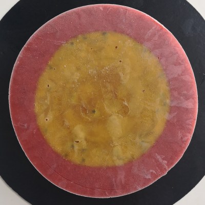 Positionnez votre insert mangue/passion au centre du cercle et versez le coulis de fraises refroidi par dessus.