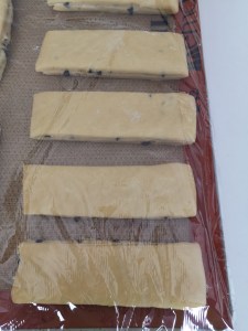 Aplatissez-la en rectangle afin de la dégazer et placez la au réfrigérateur pour 2 heures (ou 40 minutes au réfrigérateur puis 20 minutes au congélateur).