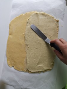 Posez la pâte sur votre plan de travail, étalez la crème avec une spatule plate sur la moitié inférieure du rectangle de pâte. L’épaisseur de la crème doit être de 4 à 5 mm.
