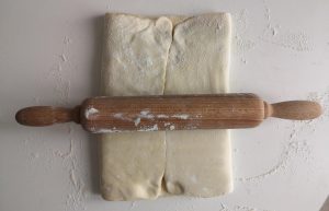 je fais des tranches avec ma plaquette de beurre, et je les place les unes à côté des autres. Je replie ma feuille et j’étale au rouleau de manière à ce que le beurre emplisse l’ensemble du rectangle.