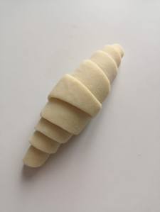 Pour réalisez les croissants, il vous fait couper des triangles assez long avec une base de 5cm. Prenez un couteau bien tranchant pour ne pas abîmer la pâte. Roulez les croissants, de la base, vers la pointe.